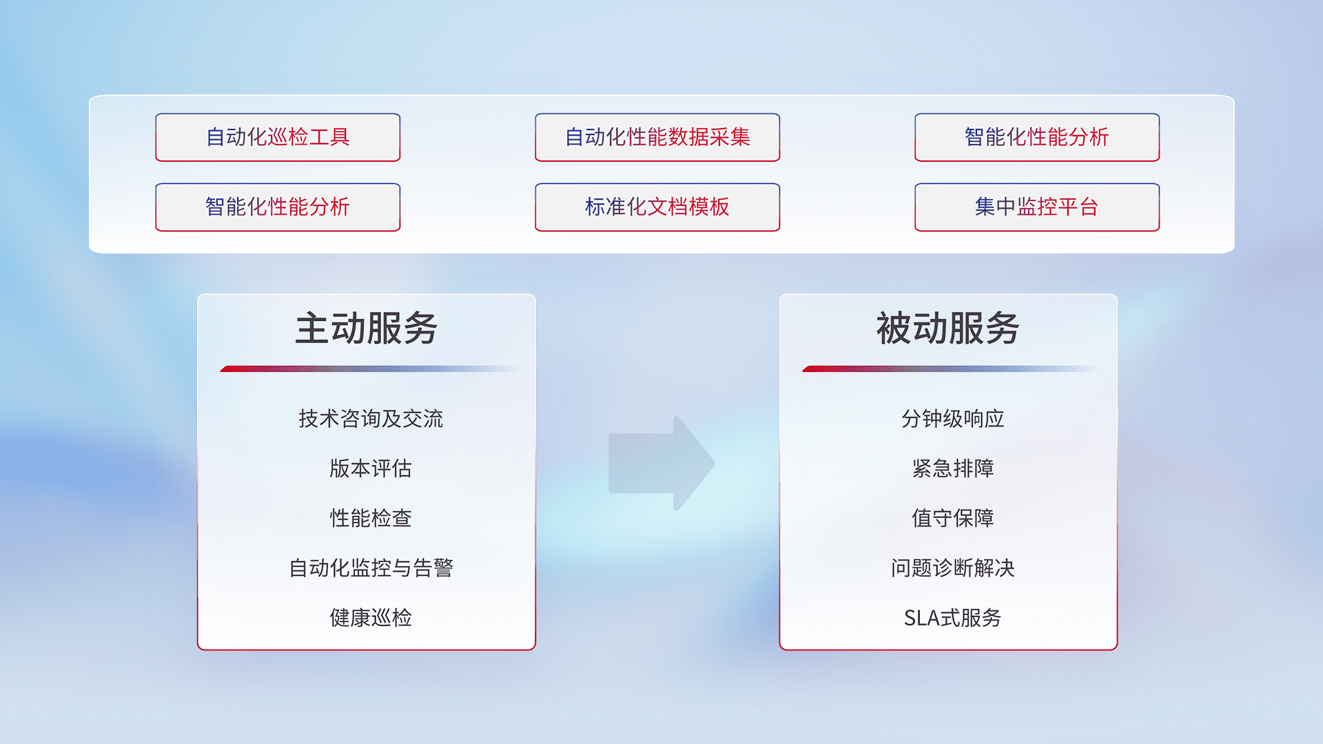 智能化工具和标准化文档,,保障服务质量,,提供主动服务(包含技术咨询、、、、版本评估、、、性能检查、、、、自动化监控与告警、、、、健康巡检)和被动服务包含(分钟级响应、、紧急排障、、、、值守保障、、问题诊断解决、、SLA服务)。。。